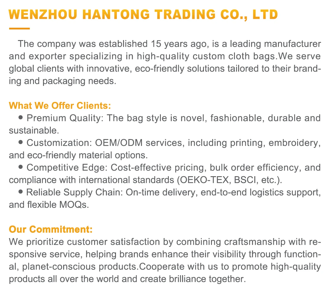 Q1: Do you provide free samples?How long does it take?A:We offer free standard design samples. but customized samples may incur a small fee (refundable upon bulk order).◇Lead time: 3–5 days for stock samples;7–10 days for custom designs.◇Shipping cost:Buyer covers express shipping (DHL/FedEx). or we can use slower. cheaper options.Solution: Provide a sample policy PDF with clear pricing/terms to avoid misunderstandings.Q2: What’s your production time for bulk orders?A:Generally. it is◇Standard orders (3.000–5.000pcs): 15–25 days after sample approval.◇Rush orders: 10–15 days (surcharge applies).◇Large orders (10.000+pcs): 30–35 days (negotiable).Solution: Share a production timeline chart (design → fabric sourcing → printing → QC → shipping) to set realistic expectations.Q3: Can you customize designs. sizes. and materials?A:Yes! We support.◇OEM/ODM:Custom logos. colors. handles. and stitching.◇Materials:Organic cotton. RPET. jute. canvas. etc.◇Sizes:From small pouches to XXL totes.◇Process: Share your sketch/Pantone codes. and we’ll provide a digital mockup within 48 hours.Q4: How do you ensure quality control (QC)?A:3 step QC process1). Pre-production: Material inspection (e.g.. weight. colorfastness).2).During production: Random checks (e.g.. stitching. print alignment).3).Pre-shipment:100% inspection for defects.Subjoin: Reports provided: Photos/videos of QC stages + third-party lab tests (if needed).Solution: Invite clients to visit our factory (or join a video call during QC).Q5: What if the products don’t meet our standards?A:Refund/replacement guarantee for defective items (terms apply).◇Pre-shipment approval: We’ll hold shipment until you confirm quality via inspection reports.◇Long-term support: Dedicated QC manager for repeat orders.Solution: Include a quality pledge in contracts (e.g.. ≤0.5% defect rate).Our advantages:★ Transparency: Clear timelines. costs. and processes reduce buyer anxiety.★ Proactive communication: Visual aids (mockups. QC videos) build trust.★ Risk mitigation: Policies address concerns before they escalate.